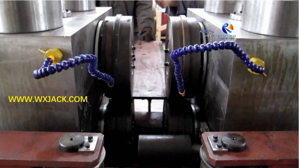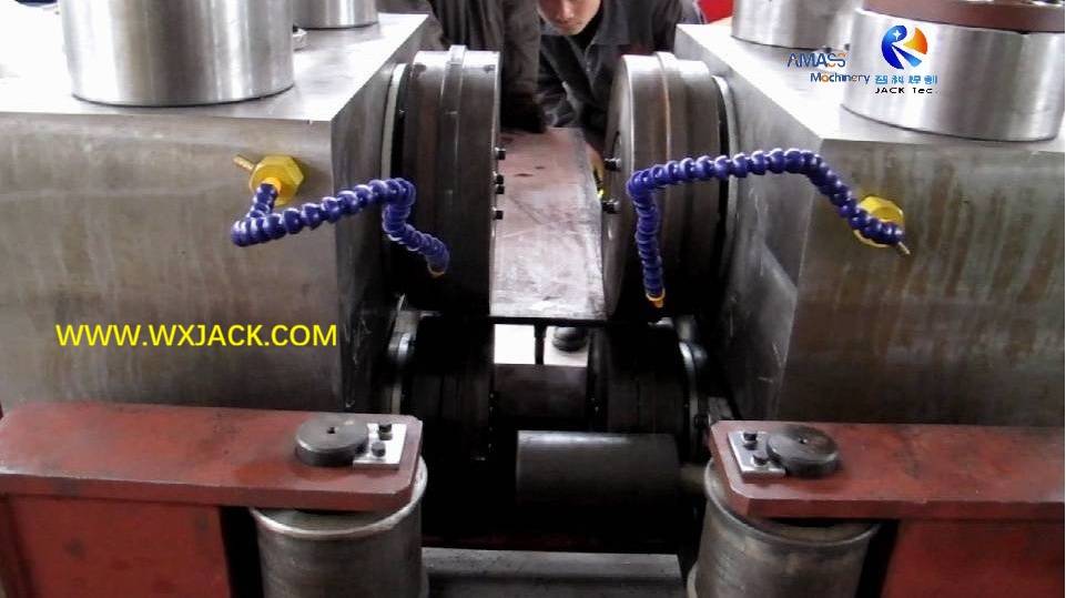6) Mientras que en el caso del redondeo de bordes en placas de acero, , la estructura de la máquina es más simple que la máquina en vigas H: no es necesario dejar espacio para la sección superior de la pieza de trabajo durante el trabajo. Por esta razón, el par superior de rodillos para redondear bordes está completamente vertical y la estructura de la cavidad para redondear bordes también es más sencilla.